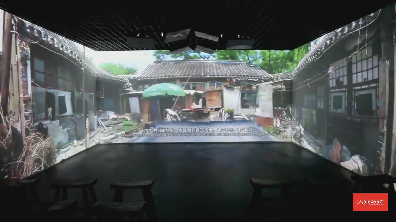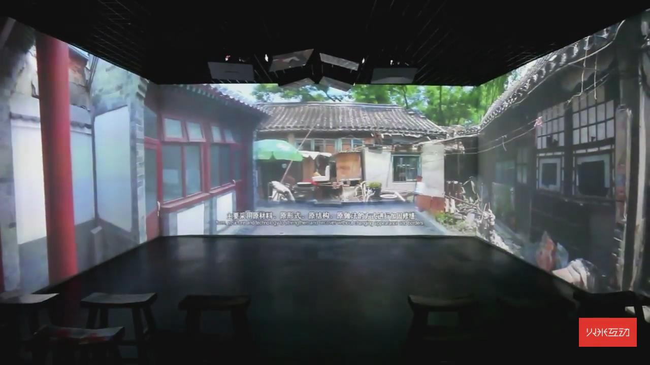通過沉浸式三折幕投影展示了北京四合院的古都風(fēng)貌,再配上立體聲效,能夠有強(qiáng)力的視聽沖擊感。